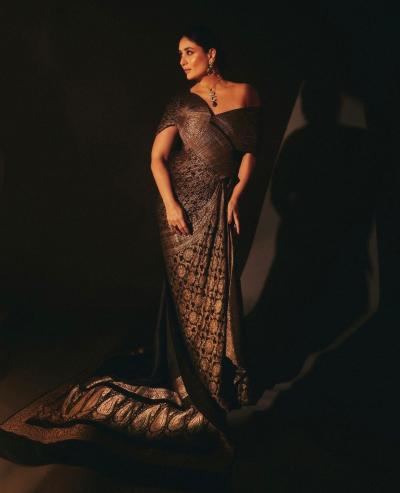 Kareena stuns in a custom corded drape gown that blends contemporary style with traditional elements. The intricate draping adds elegance, making it a perfect pick for festive gatherings.