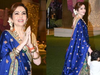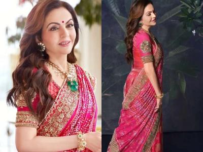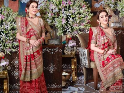 Nita Ambani looked stunning in a beautifully designed saree that showcased traditional Indian artistry. In pre-wedding functions at Jamnagar Nita wore a shimmery saree with heavy jewelry, captivating hearts with her charm and style.