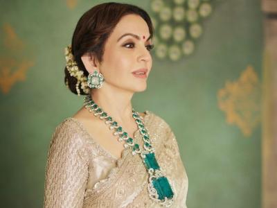 Nita looked stunning at the 'Hastakshar' Ceremony in an ivory saree with an elaborate border, paired with a diamond necklace featuring two large emeralds rumored to be worth around Rs 400 to Rs 500 crore.