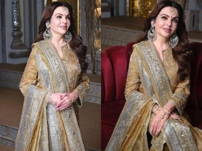 Nita Ambani looks stunning in an antique gold ensemble inspired by the classic Hyderabadi kurta and Khada dupatta, featuring antique zari and timeless zardosi embroidery with an intricate silver-gold Chatai technique border.