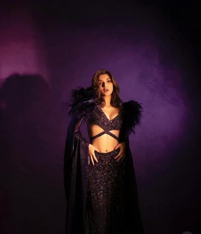 Feathers and Purple Bling: Saiee Manjrekar donned a dramatic purple outfit featuring embellished details, feathers on the sleeves with a cape-like look, and cut-outs on the waist. The actress accessorized her outfit with subtle jewelry pieces, styled her locks in loose waves, and opted for soft makeup.