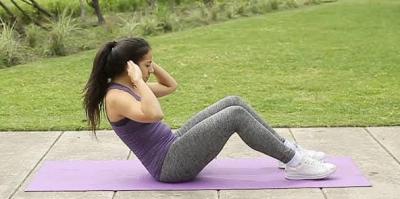 Sit on a mat to do sit ups. Then do 2 sets by doing 12 repetitions as shown in the photo. Sit ups can be seen to reduce belly fat.