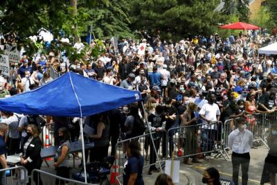 Hundreds of mourners joined an emotional memorial service in Minneapolis Thursday for George Floyd, the black man killed by police last week, as civil rights leader Al Sharpton vowed mass protests will continue until "we change the whole system of justice" in the United States. (AP Photo/Julio Cortez)