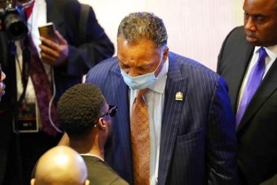 Rev. Jesse Jackson mingles with others in the Frank J. Lindquist Sanctuary at North Central University Thursday, June 4, 2020, before a memorial service for George Floyd in Minneapolis. (AP Photo/Julio Cortez)