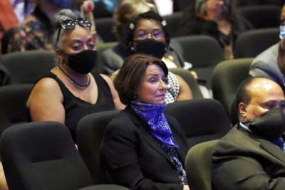 Amy Klobuchar, D-Minn center sits among guests at North Central University Thursday, June 4, 2020, before a memorial service for George Floyd in Minneapolis. (AP Photo/Julio Cortez)