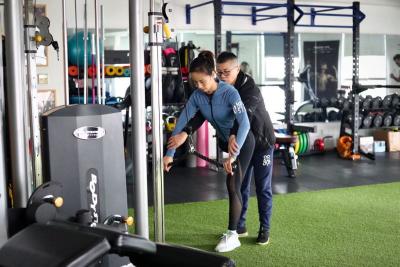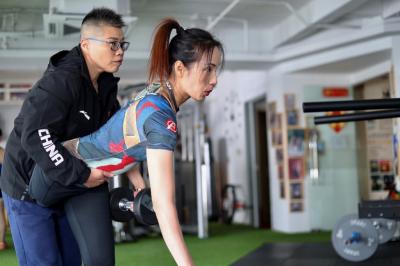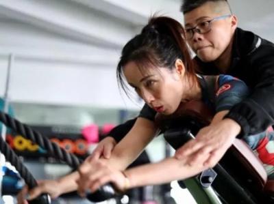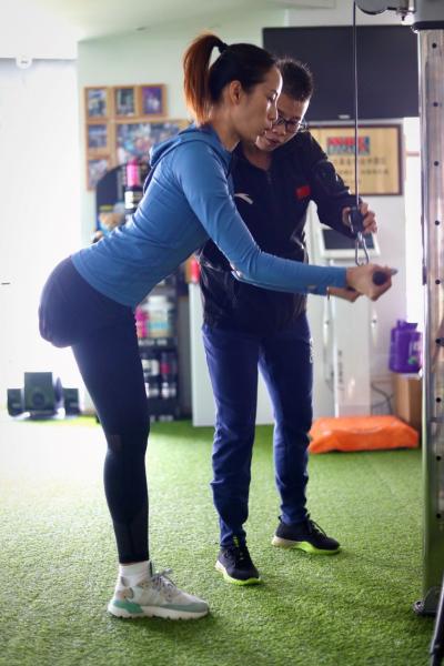 Bodybuilder Gui Yuna being assisted by her coach Zhu Liping, as she exercises at a gym in Shanghai.