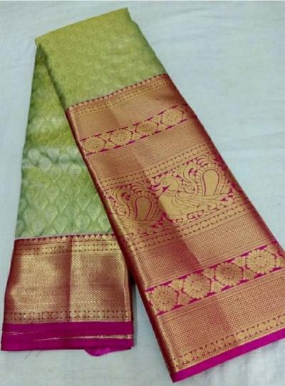 The Kanjeevaram saree from Tamil Nadu is a fine Garbrashmiya silk. Also known as the Bridal Silk Saree in South India, it is a popular choice for brides. With a history spanning over 400 years, the saree is uniquely crafted by separately weaving the 'padar' (body) and 'kad' (border), which are then joined together with a zigzag pattern called 'pitani'.