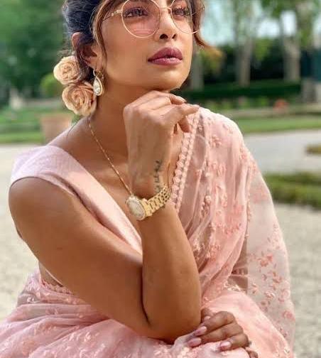 Priyanka Chopra channels a retro glam look in a blush pink saree with elegant embroidery all over. She pairs it with a wide-strapped blouse, styles her hair in a clean bun and adorns it with pink roses - bringing out the retro appeal. She adds a layer of drama by opting for tinted shades and a vintage-style watch.