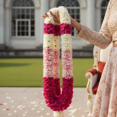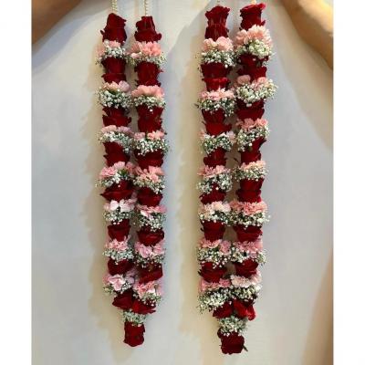 Currently, garlands of baby pink, peach, and white roses and carnations are very popular. These colors look very elegant with wedding attire.