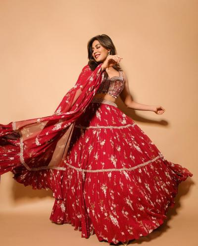 Red is a classic color for any Indian festival, and Chitrangda's minimal floral lehenga in a rich red hue is the perfect choice for Diwali. The subtle floral patterns give it a graceful touch, while the grilled dupatta adds a modern twist. Pair this look with simple yet elegant jewelry and keep the makeup soft to let the outfit speak for itself.
