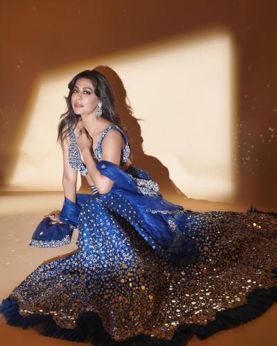 * Embrace a royal vibe mirror embellished lehenga. Go for deep colors like emerald green or royal blue, similar to Chitrangda's rich palette. Add statement jewelry and a sheer dupatta to elevate the look. This style is perfect for evening gatherings and family poojas.
