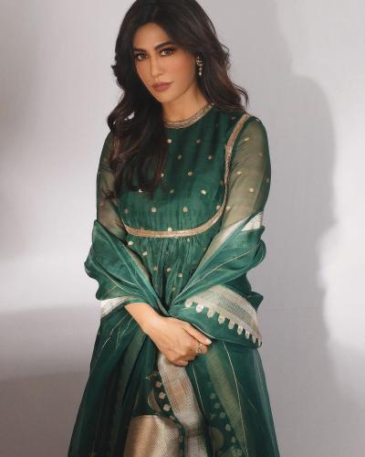 * For those who prefer understated elegance, a minimalistic Anarkali is ideal. Channel Chitrangda’s grace with a soft olive -colored Anarkali paired with delicate accessories. This outfit style is comfortable yet festive, making it ideal for day events or family gatherings.