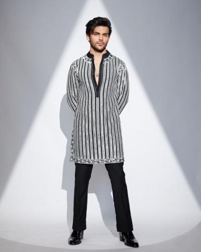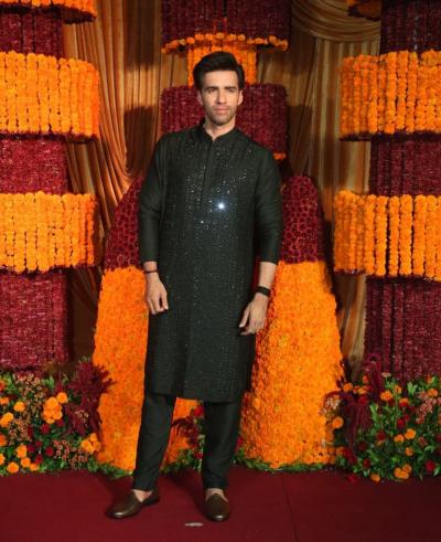 Avinash Tiwary stuns in a deep Black kurta embellished with subtle sparkles, exuding a refined festive charm. Paired with matching trousers and loafers, his look is perfect for a traditional yet stylish Diwali gathering. The understated elegance of this ensemble is ideal for anyone wanting to make a sophisticated statement. Avinash’s look is a testament to how a touch of shimmer can bring out the festive spirit without going overboard, making it an excellent choice for a family celebration or a festive get-together with friends.