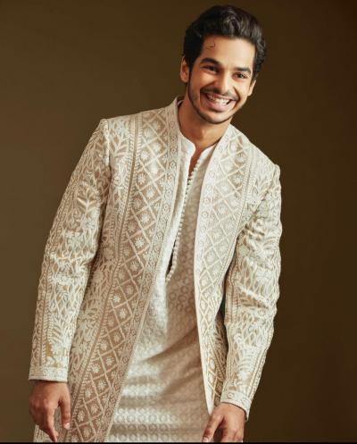 Ishaan Khattar’s Diwali look is all about understated elegance. He wears an off-white chikankari kurta with an embroidered jacket, paired with white pajamas and juttis. The delicate chikankari adds a touch of tradition, making his outfit perfect for festive gatherings. This all-white ensemble exudes grace, offering a timeless choice for the season!