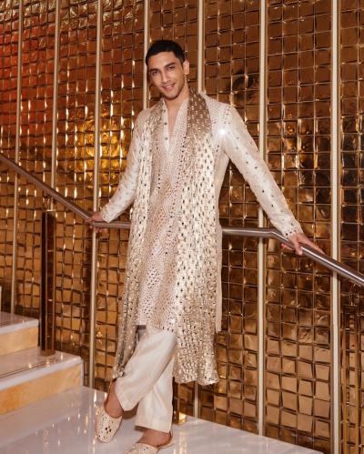 Vedang is the perfect inspiration for a traditional Diwali puja look. He’s wearing a beige embellished kurta pajama with a golden stole, paired with beige mirror work juttis. This outfit is a blend of class and tradition, ideal for a puja at home or a family gathering!