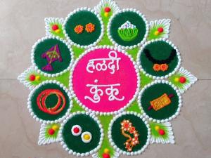 1 / 8A large and elegant Rangoli in the Sanskar Bharati style looks very beautiful for the Haldi Kumkum ceremony (Haldi Kumkum 2026). It primarily uses floral motifs, vines, and circular patterns.2 / 8On this day, the Rangoli mainly features images of earthen pots (sugad), sesame seeds, jaggery, and kites, which are considered symbols of Makar Sankranti.3 / 8Drawing a turmeric and vermilion container or placing two small plates at the center of the Rangoli and filling them with yellow and red colours makes it look more striking.4 / 8If you prefer simplicity, a Rangoli made using marigold flowers and mango leaves looks natural and refreshing.5 / 8Using dark red, yellow, and green colours on this day makes the Rangoli look traditionally attractive.6 / 8Overall, Rangoli is not just a decoration; it is considered a symbol of welcoming married women and bringing auspiciousness.7 / 8If you do not have much time to draw a Rangoli, you can use ready-made stencils to create a beautiful design.8 / 8