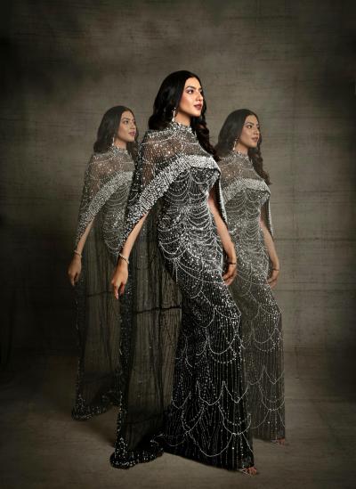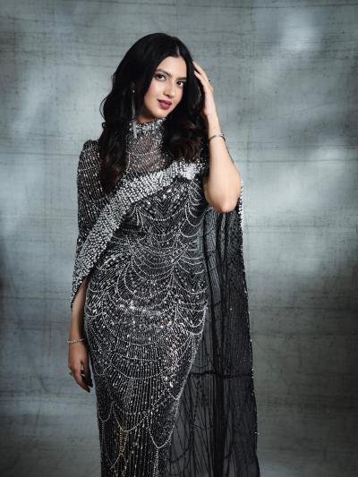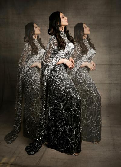 Stepping into a breathtaking black gown drenched in intricate silver beadwork, Kashika channels an ethereal blend of Old-Hollywood elegance and contemporary stardust.