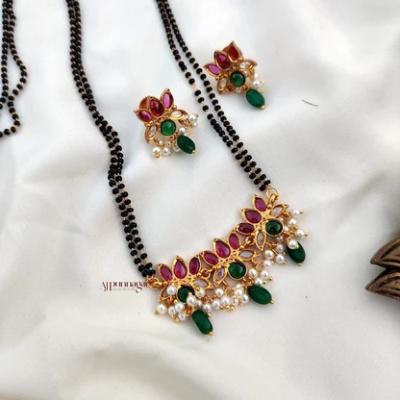 You can wear this mangalsutra with any simple saree. This mangalsutra is available in yellow gold, rose gold, or with diamond embellishments.