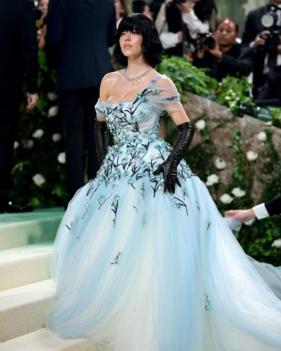 The actress wore a dark, edgy style with a short black wig that matched her powder blue Miu Miu dress perfectly. She also had on black latex gloves and a pearl-studded veil, giving off a sophisticated gothic vibe.