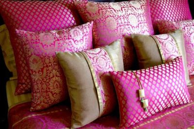 These beautiful cushion covers can be sewn using old sarees. Two contrasting colors can also be used. The combination of one color of the sofa and another of the pillows also looks good.
