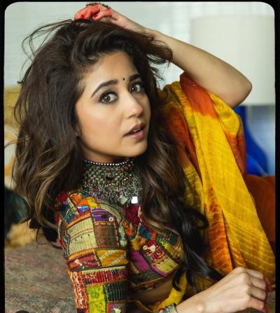 A vibrant ghagra-choli combo from her ‘Battatawada’ Instagram stories radiates festive energy. Matched with bold Jhumkas and playful bangles, this ensemble echoes old-world charm with a youthful twist. Stone-studded jhumka hoops bounce with every twirl, capturing the spirit of celebrations, while the textures elevate her ethnic attire effortlessly.