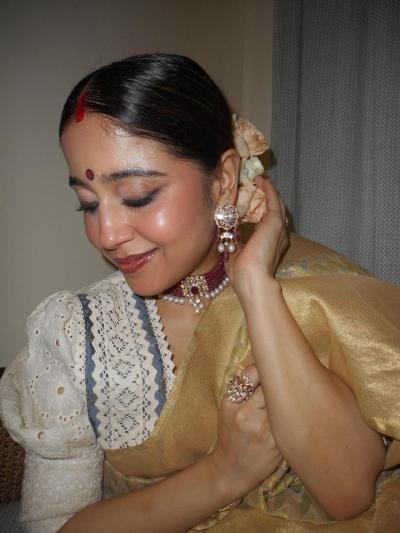 Shweta’s love for gemstone jewellery truly shines in this look, where she teams emerald drop earrings with a fresh gajra adorning her bun. The deep green stones contrast beautifully with her traditional white outfit, bringing natural elegance to the forefront. The emeralds echo the freshness of the jasmine, harmonizing nature-inspired elements in one look.
