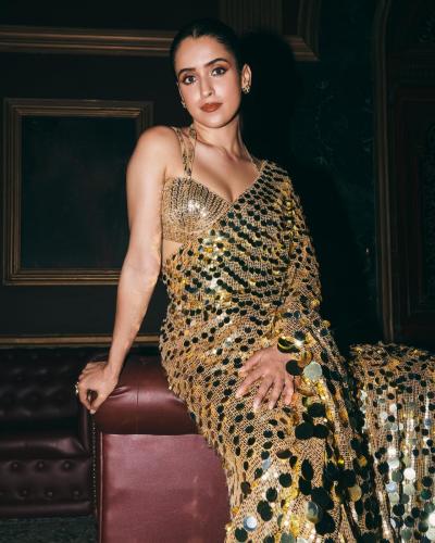 Sanya Malhotra is in her full-glam era, and this saree look of her is proof of it. The actress stunned in a heavily detailed golden saree featuring mirror work, and absolutely slayed it. She wrapped her hair in a neat bun, topped her look with simple jewellery pieces and opted for bold makeup.