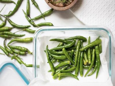 When storing green chillies, remove their stems and store them in airtight containers. It's best to use glass or steel containers for storing peppers to maintain their freshness.