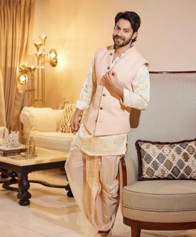 Varun brings playful vibes to a pooja ceremony with his beige kurta, baby pink dhoti, and matching pink bandi. Paired with pink juttis, this look is soft, fresh, and perfect for a daytime event.