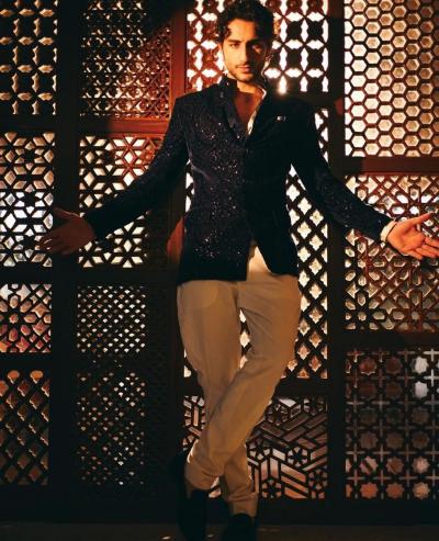 Ibrahim’s navy blue sequined Jodhpuri paired with beige pants and black juttis is another great option for sangeet. This look is both elegant and modern, perfect for an evening of music and fun.