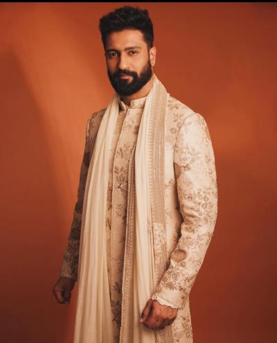 For a royal shaadi look, Vicky’s beige sherwani with gold flower embellishments and a simple beige shawl with a border is all about timeless elegance. This is the ultimate outfit for a classy and traditional wedding.