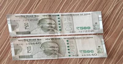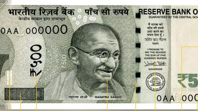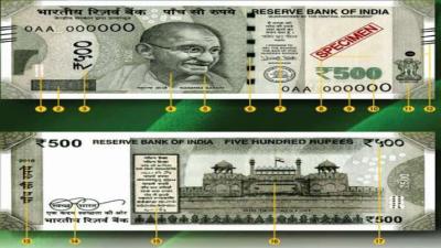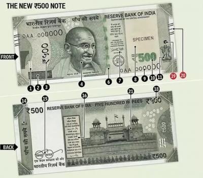 500 numbers will be written in Devanagari. 4) The orientation and position of Mahatma Gandhi's photo will be slightly different compared to the old notes. 5) When the notes are slightly broken, the color of the security thread changes from green to blue.