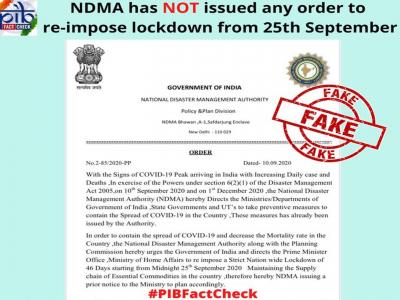 "Claim: An order purportedly issued by National Disaster Management Authority claims that it has directed the government to re-impose a nationwide lockdown from 25th September. PIB Fact Check: This order is Fake. NDMA has not issued any such order to re-impose lockdown," PIB Fact Check tweeted along with a screenshot supposed to be of the agency's order.