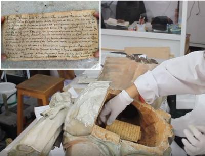 A time capsule was discovered in November 30, 2017, in Burgos, Spain. A wooden statue of Jesus Christ had hidden inside it a document with economic, political and cultural information, written by Joaquín Mínguez, chaplain of the Cathedral of Burgo de Osma in 1777.