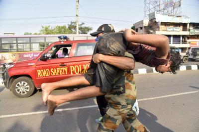 A boy affected by a chemical gas leak is carried to an ambulance in Vishakhapatnam