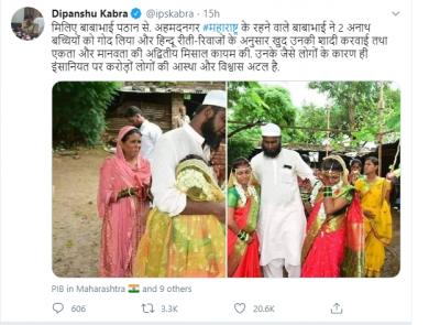 Muslim man Bababhai Pathan, from Ahmednagar, Maharashtra, has adopted two orphan sisters & wedded them from his own expenses according to the Hindu rituals. He has been widely praised for his humanitarian work across the country.