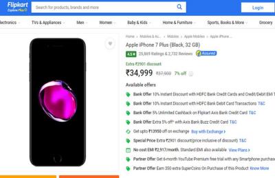 The 32 GB storage variant of the Apple iPhone 7 Plus is being sold at Flipkart Sale at a discount of 7 percent. Customers can buy the iPhone 7 Plus 32GB storage variant for Rs 34,999 (MRP 37999 rupees).