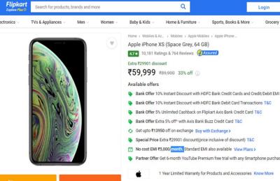 The Flipkart sale is giving a 33 percent discount on the 64 GB storage variant of the app iPhone XS. Customers can buy the iPhone XS 64GB storage variant for Rs 59,999 (MRP Rs 89,900).