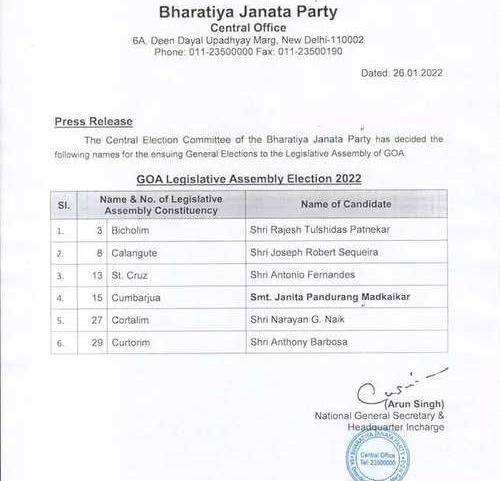 BJP announced a list of 6 candidates for the upcoming Goa Elections 2022. According to the list, Rajesh Tulsidas Patnekar will contest from Bicholim, following Joseph Robert Sequeira from Calangute, Antonio Fernandes from St. Cruz, Janita Pandurang Madkaikar from Cumbarjua, Narayan G. Naik from Cortalim, and Anthony Barbosa from Curtorim.