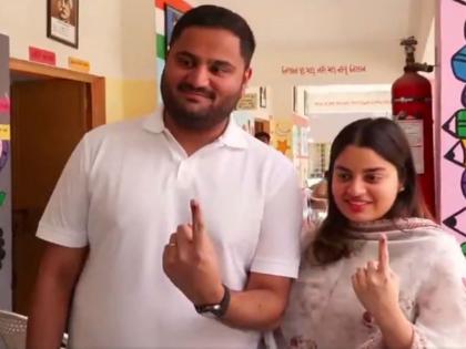 Gandhinagar (Gujarat) [India], April 26 : Adani Airport Holdings Limited (AAHL) Director Jeet Adani and his wife Diva Shah on Sunday cast their vote at a polling station in Ahmedabad, Gujarat, for the ongoing local body.