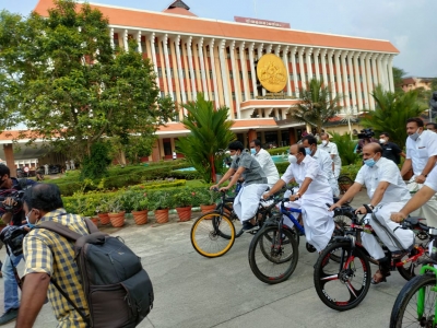 Thiruvananthapuram, Nov 11 The legislators belonging to the opposition Congress-led UDF on Thursday reached the Assembly on bicycles to register their protest against the Pinarayi Vijayan government for not reducing taxes on petroleum products.