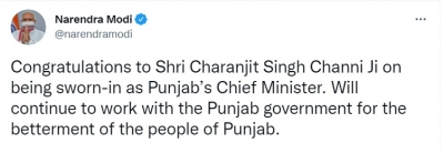 "Congratulations to Shri Charanjit Singh Channi Ji on being sworn-in as Punjab's Chief Minister. Will continue to work with the Punjab government for the betterment of the people of Punjab," Modi tweeted.