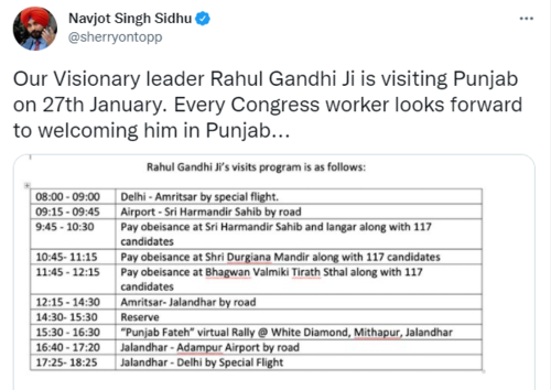 Punjab Congress Chief Navjot Singh Sidhu on Tuesday informed that the Congress leader Rahul Gandhi will visit Punjab on 27th January for the upcoming polls. As per the program published by Sidhu, Rahul Gandhi will offer prayers at Sri Harmandir Sahib, Amritsar & visit Bhagwan Valmiki Tirath Sthal along with 117 candidates.