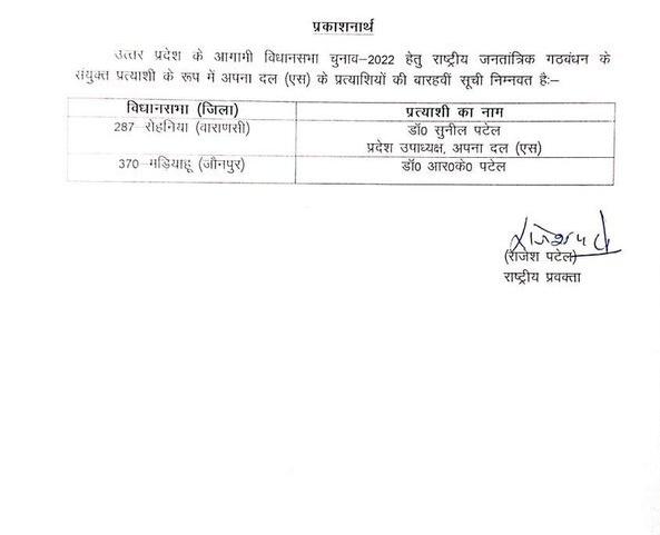 Ahead of assembly elections in Uttar Pradesh, Apna Dal has announced names of two more candidates for the polls. The candidates are Sunil Patel and R K Patel from Rohnia (Varanasi) and Madiyaon (jaunpur) respectively.