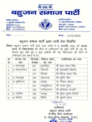 Bahujan Samaj Party releases a list of nine candidates for the sixth & seventh phases of the Uttar Pradesh Assembly elections. See the list here,