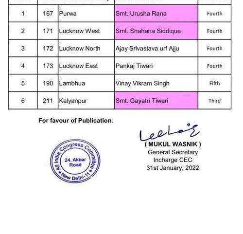 Congress released its 5th list of candidates ahead of UP polls. According to the list, Urusha Rana will be contesting from Purwa, following Shahana Siddhique from Lucknow West, Ajay Srivastava from Lucknow North, Pankaj Tiwari from Lucknow East, Vinay Vikram Singh from Lambhua and Gayatri Tiwari from Kalyanpur.