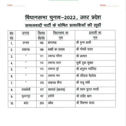 Samajwadi Party released a list of candidates for 10 constituencies, including for all 6 seats in Lucknow ahead of Uttar Pradesh assembly elections. See the list here,