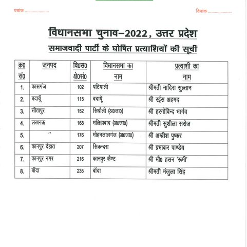 Samajwadi Party released a list of eight candidates for the upcoming Uttar Pradesh Assembly elections, see the list
