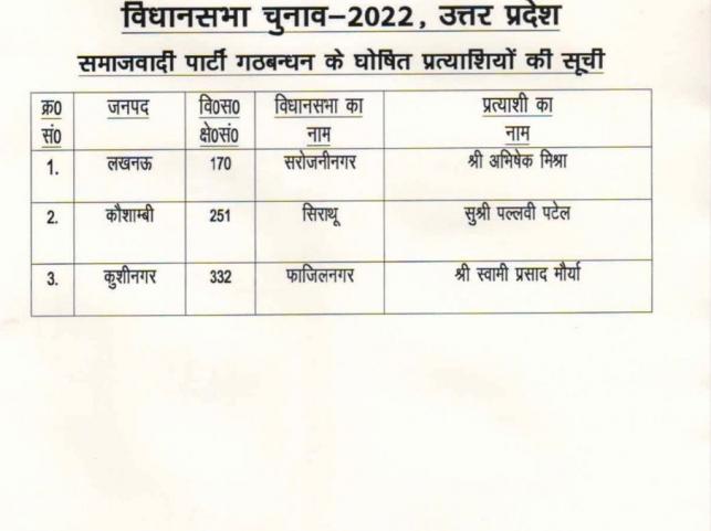 The former BJP leader and current SP candidate Swami Prasad Maurya will also contest from the Fazilnagar seat. He was the MLA from Padrauna. However, the SP has fielded Union Minister Anupriya Patel's sister Pallavi against UP Deputy CM Keshav Prasad Maurya from Sirathu according to reports.