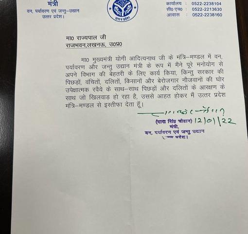 Uttar Pradesh cabinet minister and BJP leader Dara Singh Chauhan quit his post. He released the statement which reads, "Hon'ble ...